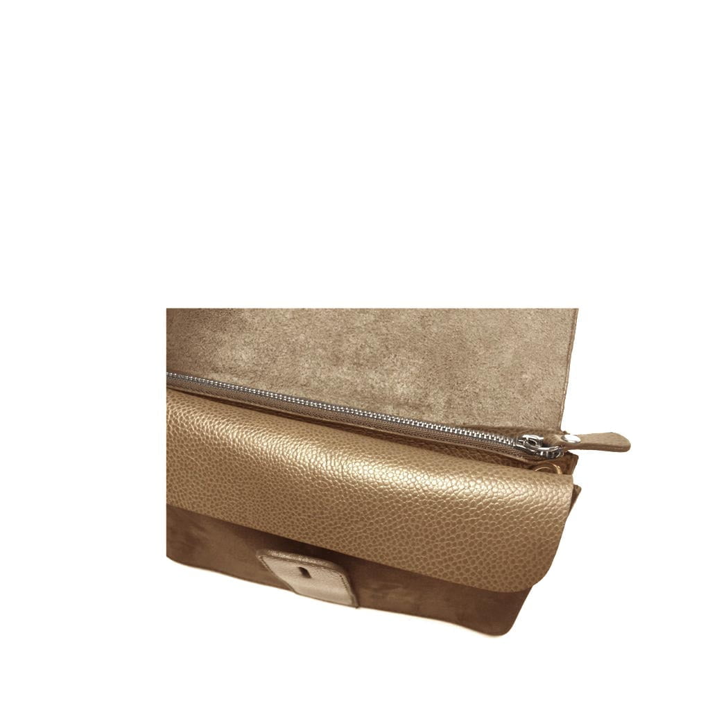 Pochette en cuir texturé marron avec rabat et fermeture à glissière.