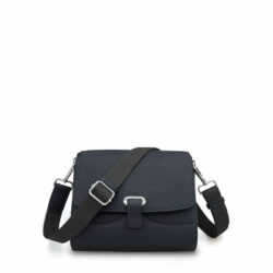 Un élégant sac à bandoulière noir avec une bandoulière réglable beige et des accessoires argentés, mis en valeur sur un fond blanc, le MIA Sangle respire l'élégance intemporelle.Présentation du MIA Sangle : un sac à main en cuir noir doté d'un rabat élégant, d'une poche extérieure et d'un élégant bouton argenté. Il est livré avec une bandoulière bicolore réglable accentuée par des détails argentés.