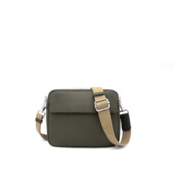 Sac fourre-tout en cuir vert olive avec deux poignées, présentant un design simple et spacieux.Un sac fourre-tout en cuir vert avec deux bandoulières, présenté sous un angle latéral sur un fond blanc.
